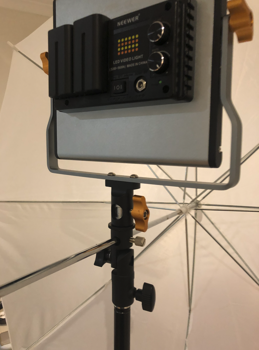 Assembling it together takes a little work since there’s no actual instruction manual. But in essence, the umbrella adapter sits atop the stand. And the light sits atop the umbrella adapter.