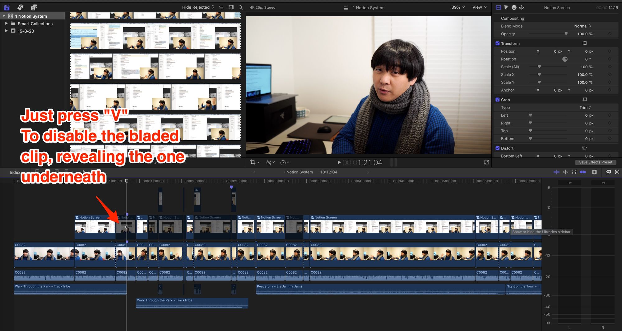 - The fastest way I found to switch between A roll and B roll (i.e. myself, vs myself + laptop screen share) is to have two separate clips going on at once, then selecting all (Cmd+A) and blading the clip (Cmd+B) and then disabling the one that you don’t want (V). I don’t know if this is the most efficient way to use this flow, because I “invented” this method myself for this specific need. But this is how you switch quickly between two clips on Final Cut Pro.