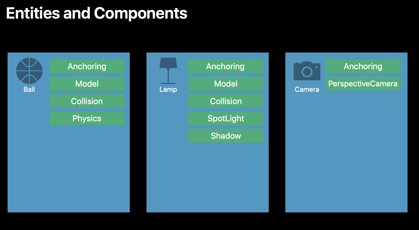 And so components define the properties that are needed between each entity in your AR world. This is actually really great because it helps to optimise performance - if there’s components that are used by different entities, then this is highly optimised by ARKit.
