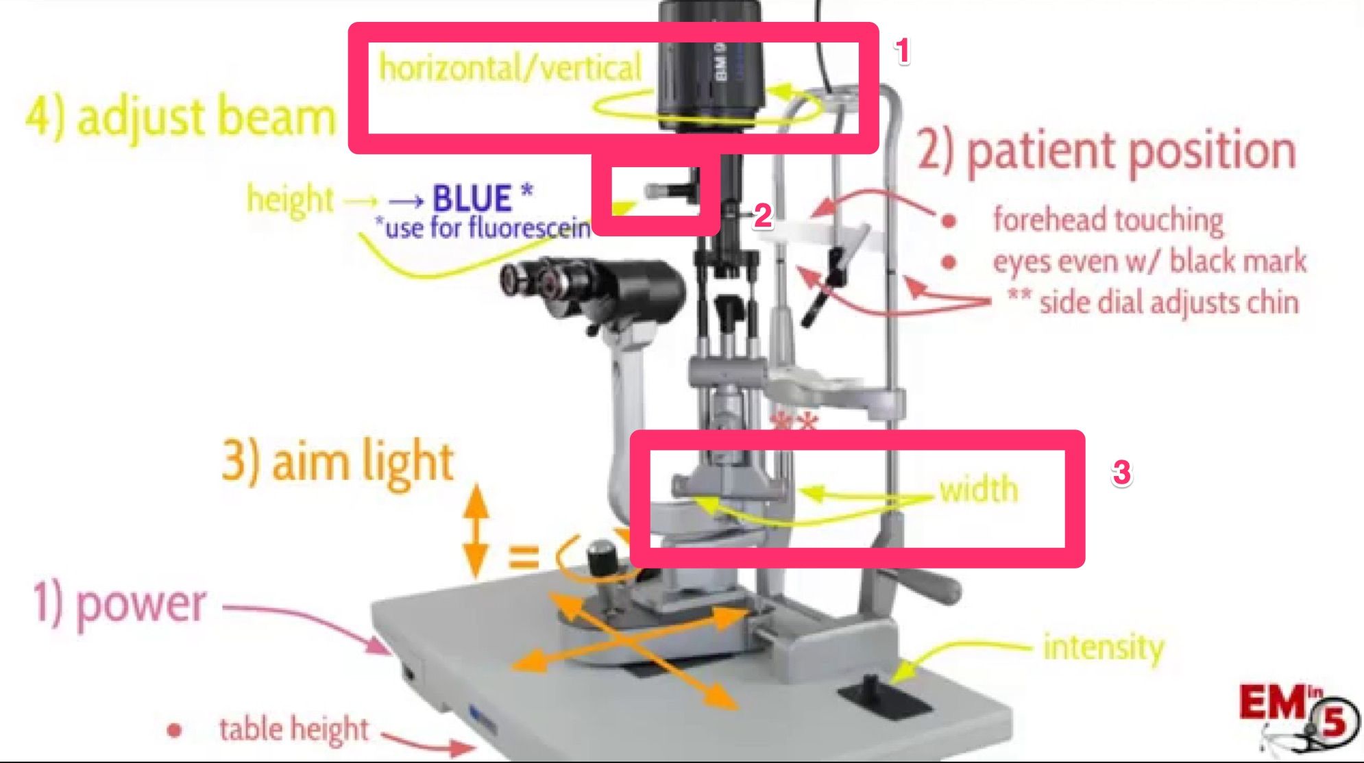 Knob at square 2 adjusts vertical height, but at its max is the blue light which you use for checking fluroscein staining.
